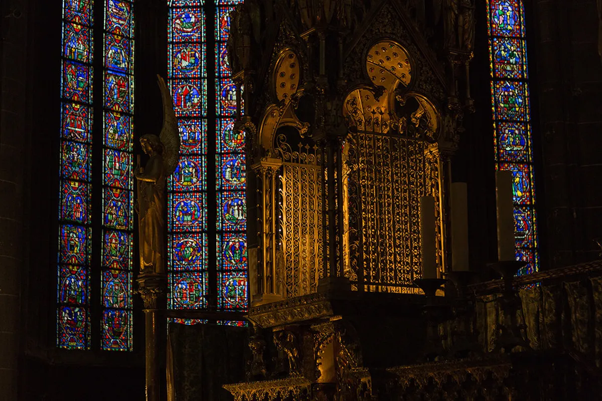 Beneath the floor lies an ancient Romanesque crypt. This area contains remains from the 10th-century church building. It is much older than the Gothic cathedral above it. You can see early stone carvings and ancient sarcophagi here. The crypt offers a cool and quiet atmosphere.